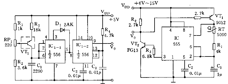 如图所示,IC1为双时基电路556,其中左半(1/2 556)与R3、VT1、c1等组成温度/频率变换多谐振荡器,IC1-2(1/2 556)与R4、c3组成单稳触发器。VT1采用PNP二极管作为温度传感器,当温度在0~100度范围内变化时,由于管子内阻随温度的变化,使振荡频率的变化范围为3.4kHz~5kHz,线性误差小于正负0.5度。IC1的输出经IC2单稳触发器整形,得到脉宽恒定的矩形波。
