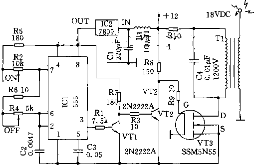 电路如图18—1所示。由脉冲发生器、驱动器和高压变压器组成。脉冲发生器利用一个555定时器产生连续的脉冲串到VTI。VTI作为缓冲器,起到隔离ICI和VT3栅极的高空抗负载的作用。电阻R1和R3、R2和R4调节ICI③脚的输出脉冲频率。该脉冲串控制T3的通断,在T1的初级产生高频交变磁场,从而在T1的次级产生所需的高频、高压电流。TI可采用现成的黑白电视机中的行输出变压器。