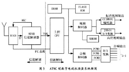 ATSC制机顶盒系统可分为两个相对独立的模块:前端信道解调和后端信源解码。前端和后端接口的数据格式是TS码流。前端部分主要完成高频下变换和 8VSB信道解调,并输出TS流;后端部分实现TS流的解复用,并将视频和音频的ES/PES流分别送入相应的音视频解码器,最终输出视频和音频信号。系统的整体控制部分由后端的主控CPU负责,包括I2c总线,前端的信道解调,TS流解复用,音频解码和视频解码,以及遥控器和键盘等流程控制。图3表示了 ATSC制机顶盒的系统设计框图。