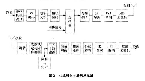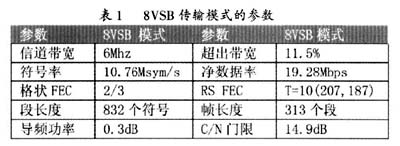 以地面广播8VSB模式为例,信道调制与解调原理如图2所示。发送端:码率为19.39Mbps的TS流输入到信道调制单元。信道编码过程包括数据随机处理,RS纠错编码,卷积交织,格状编码,同步信号插入,形成符号率为10.76Msym/s的8电位符号流(八种电位:±7V,±5V,±3V,± 1V)。然后进行模拟处理,插入导频,预均衡和单边带调制,最后送到发射机。接收端:射频RF经调谐器锁定,形成中频IF输出,A/D变换后逐级进行 8VSB信道解调处理,完成解调后输出码率为19.39Mbps的TS流。8VSB传输模式的参数如表1所示。