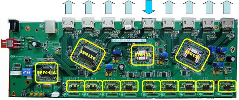 The EP9134 is a 4-Port DVI/HDMI splitter with integrated HDCP decryption/encryption engines and is compliant with HDMI Rev 1.3b and HDCP Rev 1.2 specifications. The EP9134 receives DVI/HDMI inputs, process HDCP decryption and encryption and transmits the data to 4 DVI/HDMI ports. The chip uses an external EE to store the encrypted HDCP receiver/transmitter keys.