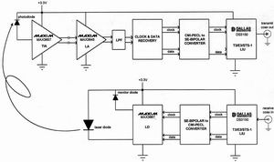 在TDM系统,时钟和数据一起的线路编码/译码通常采用Manchester技术。对于光纤中的光信号调制,激光器/LED发送器/接收器用“光亮”做为逻辑1,“光灭”做为逻辑0。光接收机检测来自光纤的信号并把光信号变换回电信号,在时钟和数据恢复前必须放大它们。图1示出用于光TDM系统的典型接收器和发送器对的框图。