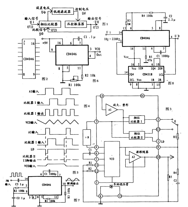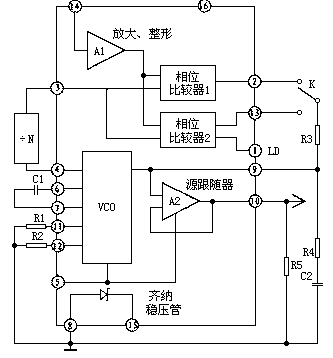 CD4046内部还有线性放大器和整形电路,可将14脚输入的100mV左右的微弱输入信号变成方波或脉冲信号送至两相位比较器。源跟踪器是增益为1的放大器,VCO的输出电压经源跟踪器至10脚作FM解调用。齐纳二极管可单独使用,其稳压值为5V,若与TTL电路匹配时,可用作辅助电源。