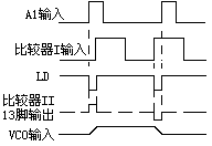 对相位比较器Ⅱ而言,当14脚的输入信号比3脚的比较信号频率低时,输出为逻辑“0”;反之则输出逻辑“1”。如果两信号的频率相同而相位不同,当输人信号的相位滞后于比较信号时,相位比较器Ⅱ输出的为正脉冲,当相位超前时则输出为负脉冲。在这两种情况下,从1脚都有与上述正、负脉冲宽度相同的负脉冲产生。从相位比较器Ⅱ输出的正、负脉冲的宽度均等于两个输入脉冲上升沿之间的相位差。而当两个输入脉冲的频率和相位均相同时,相位比较器Ⅱ的输出为高阻态,则1脚输出高电平。上述波形如图5所示。由此可见,从1脚输出信号是负脉冲还是固定高电平就可以判断两个输入信号的情况了。