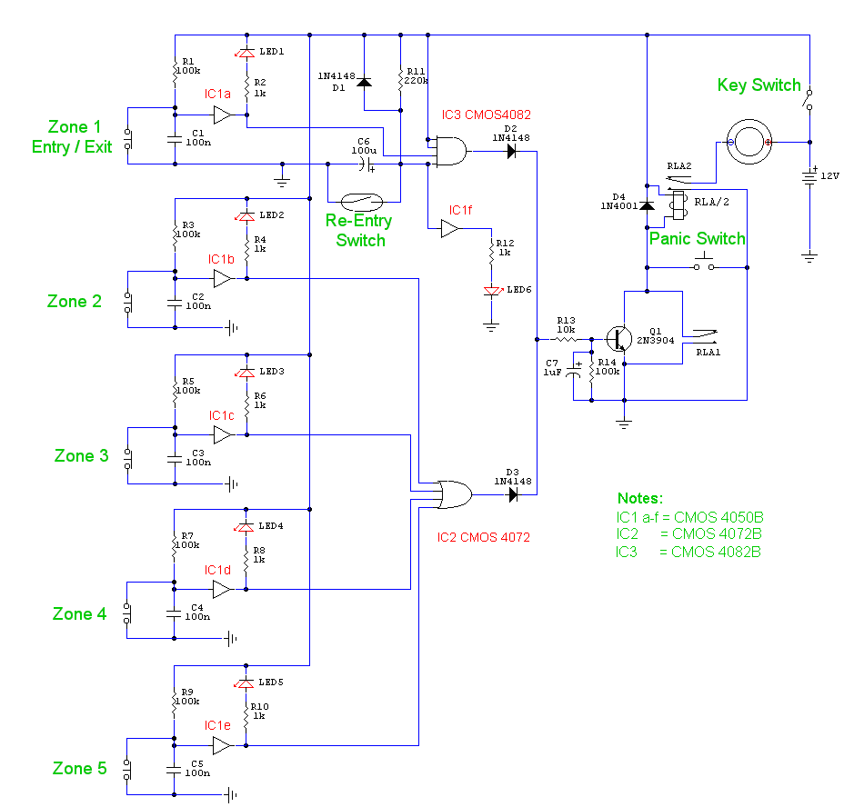 This is a complete alarm system with 5 independent zones suitable for a small office or home environment. It uses just 3 CMOS IC's and features a timed entry / exit zone, 4 immediate zones and a panic button. There are indicators for each zone a "system armed" indicator. The schematic is as follows: