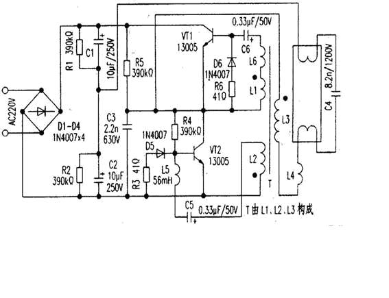 电路如下图所示。该电路由整流滤波电容、高频振荡电路以及输出负载屯路三部分构成。交流220V经整流滤波输出约300V直流为振荡电路提供电源。开机后,电源经R5对C3充电,使Vc3迅速升高,从而使VT2迅速达到饱和导通;此时由于T的反馈作用使VTI截止。VT2一旦导通,则Vc3下降,流过L2的电流减小,引起L2两端一个上负下正的电压。据同名端原则,L1得到上正下负的反馈电压,从而使VTI迅速饱和导通,同时T的正反馈作用又使VT2迅速截止,如此周而复始形成振荡方波(R6D6、R3D5起续流作用)。负载回路由L3、L4、C4构成。VTI、VT2产生的高频振荡方波由L3加给负载作激励源。灯管点亮前,由C4、L4等形成很大的谐振电梳流过灯丝,使管内氢气电离,进而使水银变为水银蒸汽,C4两端的高电压又使水银蒸汽形成弧光放电,激发管壁荧光粉发光。灯管点亮后,C4基本上不起作用,此时L4则起阻流作用。 常见故障1. VTl、VT2击穿进而导致D1-D4被击穿,此时将引起电源短路;2.R4偏置损坏; 3.振荡电路中L5.L6易损坏;4.负载电路中C24因高压易被击穿。最后特别说明,目前市场上所见的各种40W、32W节能日光灯以及各种环形灯,均可参考此电路进行分析。