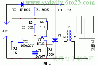 该装置电路如图1所示(点此下载原理图)。整个装置直接由220V市电经整流后供电。R3、R4、R5、C1和双基极二极管组成张驰振荡器,其输出脉冲信号用于控制可控硅的导通和关断。不可控硅处于关断状态,市电经VD整流再经R6和L1的等效电阻向C3充电。当VS被触发导通后,C3上的电荷经导通的可控硅和L1的等效电阻迅速放电。当放电电流过零时,可控硅又自动关断。如此反复循环,在变压器的次级L2就获得了高压脉冲电压,这一电压加在由许多等距离金属丝组成的电网上,电网下设有诱饵,苍蝇嗅到诱饵而来,着落时触及电网而被电死,死蝇从网距空间自动下落,达到自动灭蝇的效果。