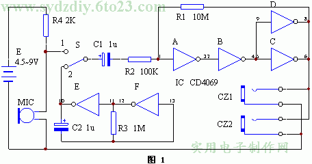 该机电原理见图1(点此下载原理图)。它由一个CMOS六反相器组成。A—D组成奇数级负反馈放大器。R1为反馈电阻,调节R2和R1的比值可调节电压增益,其典型增益可达100倍。F3和F4并联是为了增强放大器的负载能力。E和F构成一个低频信号发生器,它是一个最简单的CMOS多谐振荡器。它的振荡频率约为0.7Hz。改变C2或R3,可改变其振荡频率。R4和MIC构成拾音电路。