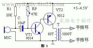 话筒MIC选用普通驻极体电容话筒,T采用便携式收音机输出变压器铁芯绕制,初级用Φ0.15mm漆包线绕80匝,次级用Φ0.08mm漆包线绕5000匝。RP为47k带开关的电位器。电源采用二节5号电池。电极用厚0.5-1mm左右的铜片焊上两根细绝缘导线,并将铜片弯成指环套在不相邻的两手指上。